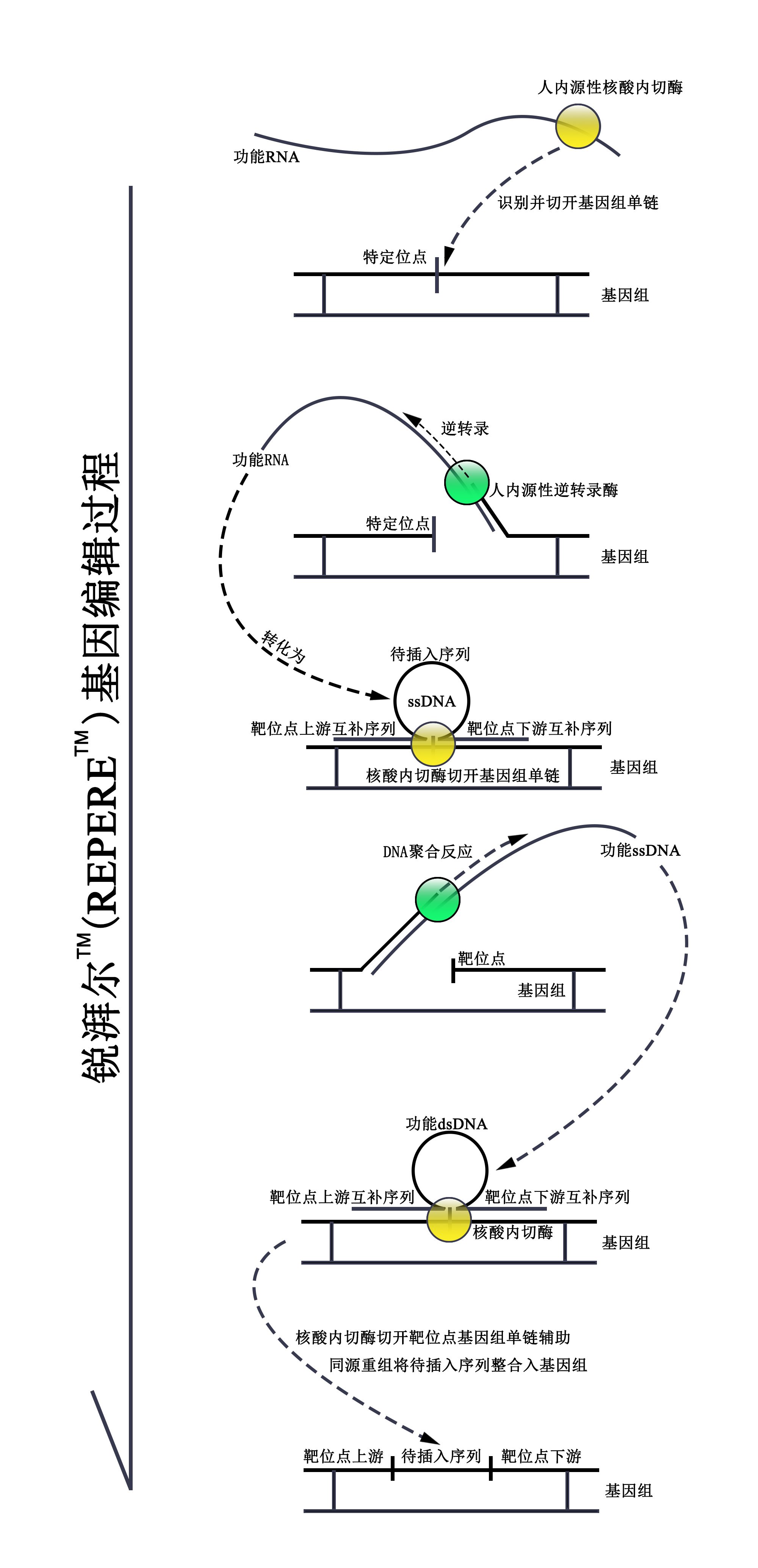 锐湃尔™应用人类基因组中的重复元件(Alu元件及LINE-1转座子)、人源核酸内切酶以及逆转录酶ORF2p,整个技术完全为人源,锐湃尔™可识别基因组上待插入序列上游的长序列片段并剪切基因组靶位点的DNA单链,同时将含有待插入序列的RNA转化为双链DNA,最终经同源重组将待插入序列插入至基因组中。该技术由于仅在待插入位点处形成双链DNA、识别序列长以及完全为人源等特点,以及人和高级哺乳动物内源性等特点,使得其具有高靶向性、低脱靶率及极低抗原性等优势,并可以较高效率向基因组插入长片段序列。同时,该技术所采用的核酸内切酶仅切开基因组单链,此后通过同源重组进行序列插入,极大的避免了使基因组发生双链断裂的风险,因此具有较高的安全性。