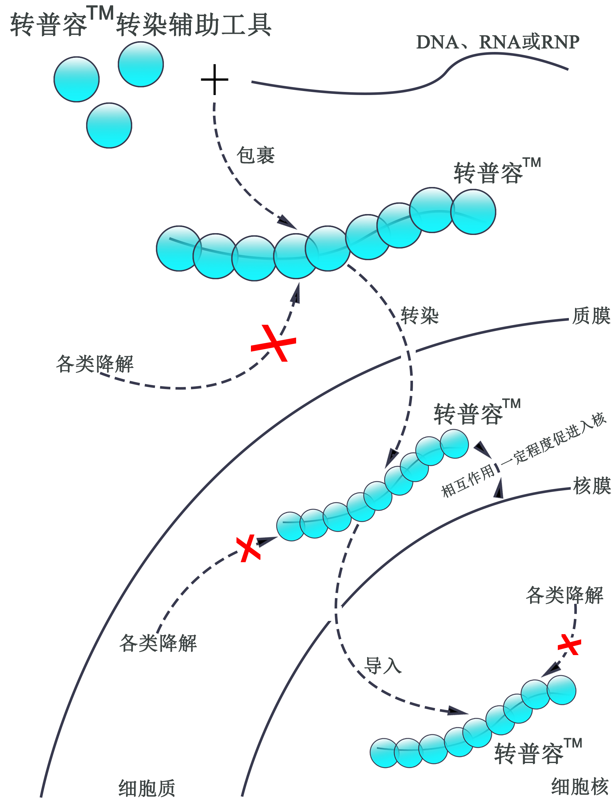 转普容™应用人源核酸结合蛋白包裹核酸或核糖核蛋白,使其免于被RNA酶等因素降解,提高核酸的完整性、留存时间及作用效率,并可同时一定程度上辅助核酸及核糖核蛋白向核内转移,利于作用于核内的相关操作如基因编辑和基因表达。